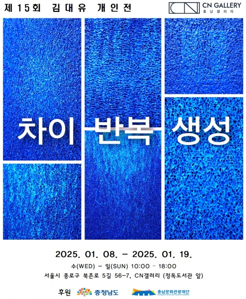 [충청뉴스큐] 충남문화관광재단은 충청남도 문화예술 서울전시장 CN갤러리에서 제15회 김대유 개인전 ‘차이·반복·생성’을 2025년 1월 8일부터 19일까지 12일간 개최한다.