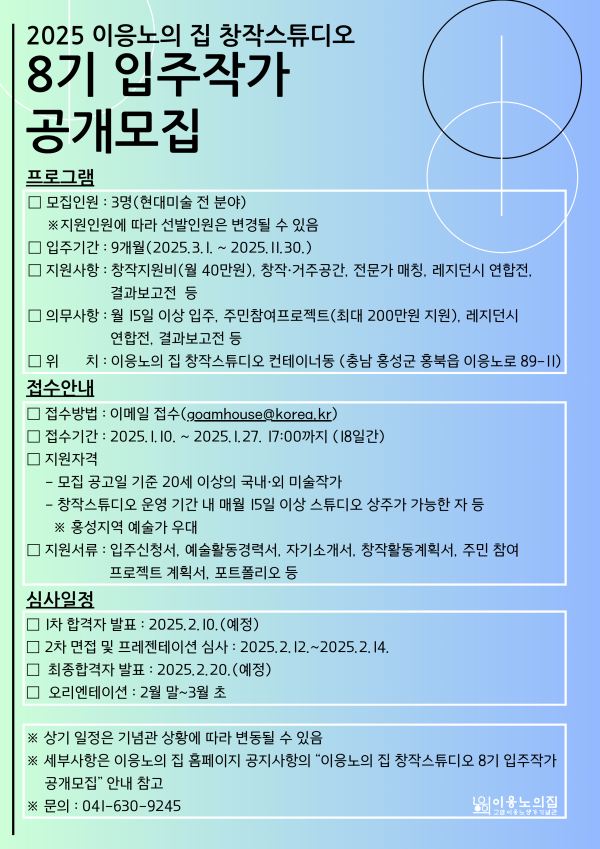 올해 8기 입주작가 공개모집에서는 모집 공고일 기준 20세 이상의 국내·외 미술작가 중 입주 기간 내 매월 15일 이상 창작스튜디오에 상주가 가능한 현대미술 전 분야의 미술작가 3명을 모집할 예정이다.