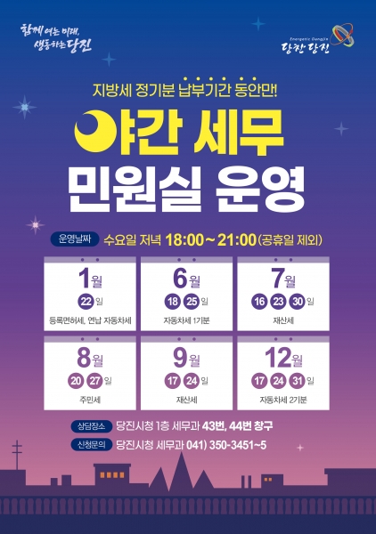 ‘야간 세무민원실’은 지방세 정기분 납부 기간 중 수요일 오후 6시부터 9시까지 3시간 동안 당진시청 1층 세무과 43번과 44번 창구에서 운영하며 전화 또는 방문을 통해 지방세 납부 및 각종 지방세 관련 문의·상담 등의 행정서비스를 제공할 예정이다.