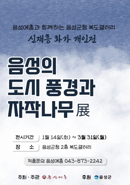 [충청뉴스큐] 음성군은 지역주민의 문화 복지 증진을 위해 14일부터 3월 31일까지 음성군청 2층 복도 갤러리에서 1분기 작품 전시회를 운영한다고 밝혔다.