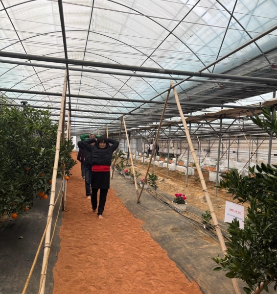 ‘황토 맨발체험길’은 아열대스마트온실 맞은편에 위치한 천혜향 하우스에 조성됐으며 폭 1m, 길이 150m로 하우스 내 천혜향 나무들 사이를 둥글게 걸을 수 있게 만들어졌다.