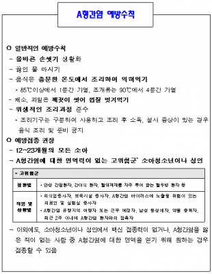 아울러 12~23개월의 소아나 A형간염에 대한 면역력이 없는 만성 간질환자, 외식업종사자, 의료인, 최근 2주 이내 A형간염 환자와 접촉한 사람 등 고위험군, 소아청소년, 성인 등에 대해서는 예방접종을 권고했다.