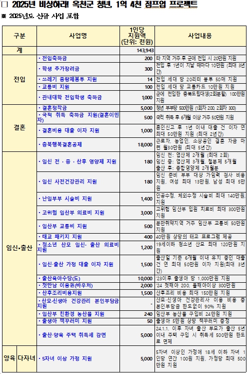 이 프로젝트는 옥천군에 정착하는 청년들에게 전입·결혼·출산 등의 생애 주기에 맞춰 총 1억 4천만원을 지원해 주는 사업이다.