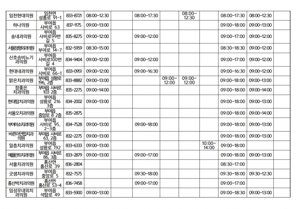 이번 설 연휴 중 “문 여는 병·의원 및 약국 정보는 응급의료정보센터 누리집과 부여군 누리집, 보건소 상황실을 통해서 안내받을 수 있다.