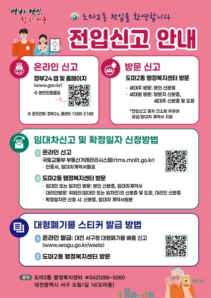 [충청뉴스큐] 대전 서구 도마2동 행정복지센터는 주민들의 생활 편의를 높이고 신속한 행정 처리를 지원하기 위해 새롭게 제작된 전입신고 안내문을 배부했다고 밝혔다.