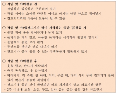 특히, SFTS 감염자 중에는 50대 이상의 농업 및 임업 종사자의 비율이 높아 농촌지역 고연령층에서 주의가 필요하며, 야외활동 후 2주 이내에 고열, 소화기증상이 있을 경우 즉시 의료기관을 방문해 진료를 받아야 한다.
