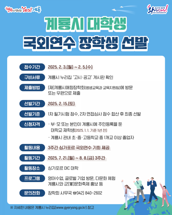 [충청뉴스큐] 계룡시애향장학회가 2025년 ‘대학생 국외연수’장학생 20명을 선발한다고 밝혔다.