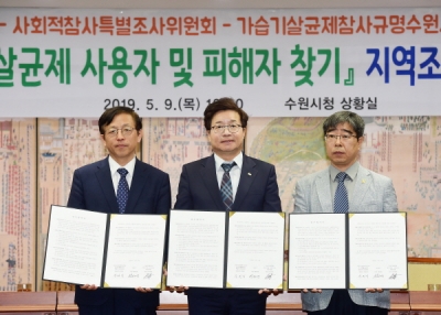 수원시와 ‘가습기살균제사건과 4.16세월호참사 특별조사위원회’, ‘가습기살균제참사규명 수원시민 공동행동’은 9일 시청 상황실에서 협약을 체결하고, ‘가습기살균제 사용자·피해자 찾기 지역조사 사업’에 협력하기로 했다.