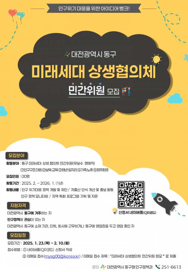 [충청뉴스큐] 대전 동구는 인구 위기의 선제적 대응을 위해 추진하는 ‘미래세대 상생협의체’ 출범을 앞두고 민간위원을 오는 10일까지 공개 모집한다고 밝혔다.