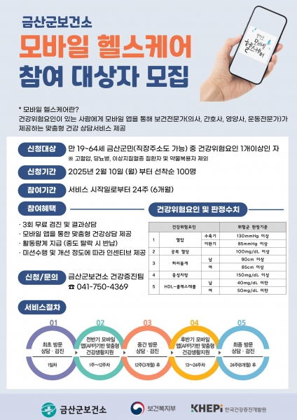 [충청뉴스큐] 금산군보건소는 10일부터 21일까지 모바일 헬스케어 상반기 대상자 100명을 선착순 모집한다.