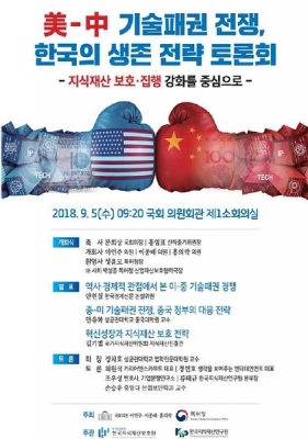이번 정책토론회는 미-중 무역전쟁을 기술 패권 확보를 위한 지식재산의 관점에서 고찰하고, 지식재산 보호 및 집행 제도 강화를 중심으로 우리 경제의 생존 전략을 모색하고자 마련됐다.