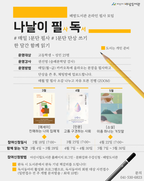 [충청뉴스큐] 아산시 배방도서관이 3월부터 5월까지 고등학생과 성인을 대상으로 온라인 필사 프로그램 ‘나날이 필독’을 운영한다.