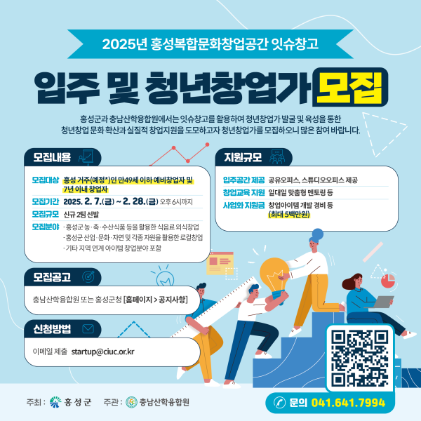 김태옥 경제정책과장은 “창업에 도전하는 청년창업가들이 이번 모집에 적극 참여해 창업가로서의 역량을 강화하고 홍성군 경제 활성화에 이바지하는 좋은 기회가 되길 바란다”고 전했다.