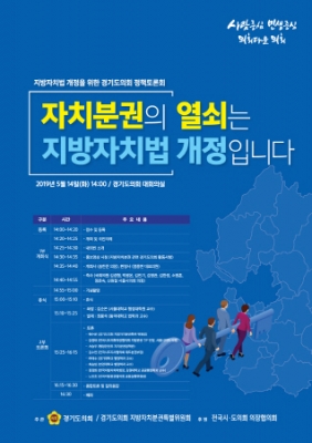 경기도의회는 오는 14일 오후 2시 도의회 1층 대회의실에서 ‘지방자치법 개정을 위한 경기도의회 토론회’를 개최한다. 경기도의회와 의회 지방자치분권특별위원회가 주관하고 전국시·도의회의장협의회가 후원하는 이날 토론회에는 경기도의회 송한준 의장, 염종현 더불어민주당 대표를 비롯해 김경협 더민주 경기도당위원장 등 국회의원, 행정학과 교수진, 자치분권 관련 공무원 등 200여 명이 참석한다.
