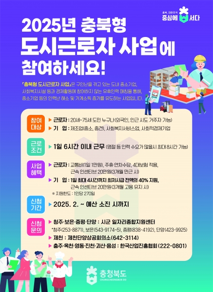 [충청뉴스큐] 충주시가 ‘2025년 충북형 도시근로자 지원사업’에 참여할 기업, 소상공인, 구직자를 모집한다.
