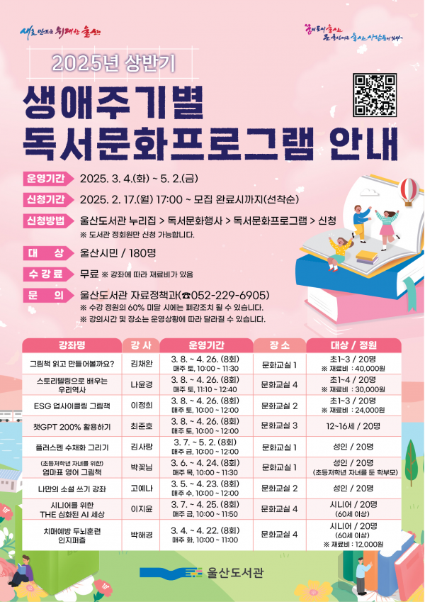 [충청뉴스큐] 울산도서관은 오는 3월 4일부터 5월 2일까지 ‘2025년 상반기 생애주기별 독서문화프로그램’을 운영한다고 밝혔다.