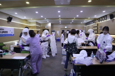 이어진 실습훈련에서는 의료기관의 감염관리 현황 및 개선방안에 대한 분임토의와 호흡기마스크 밀착도 검사를 진행했다. 이어진 구간에서는 음압병상 견학과 함께 음압병상에서의 보호복 착⋅탈의 및 전동식호흡보호구 착⋅탈의 실습을 실시하였으며 이와 같은 2일간의 모든 과정을 마친 교육훈련 이수자에게 수료증을 수여한다.