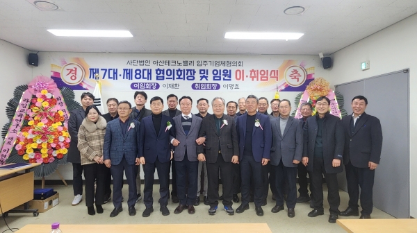 [충청뉴스큐] 아산테크노밸리 입주기업체협의회가 지난 13일 아산테크노밸리 일반산업단지 공공폐수처리시설 2층 회의실에서 제7대, 제8대 협의회장 및 임원 이·취임식을 개최했다.