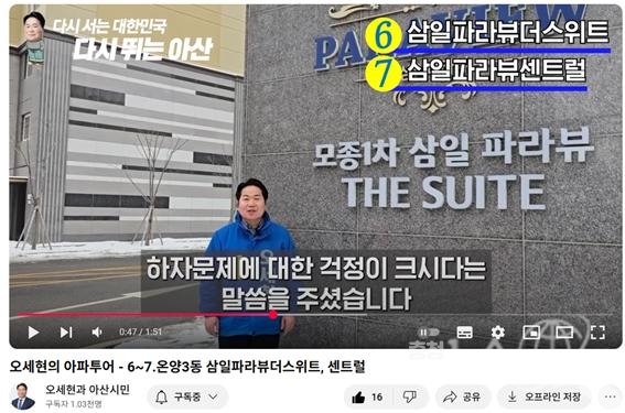 오 후보는 2월경부터 온양3동 더샾퍼스트타워 아파트를 시작으로 아파트별 민원사항을 청취하고 이를 해결할 방안을 제시하는 영상을 본인의 유튜브로 올리기 시작했고, 15일 기준 21군데의 아파트를 방문한 것으로 알려졌다.