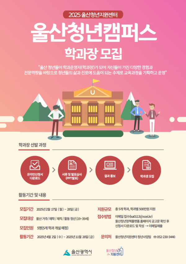 [충청뉴스큐] 울산시는 청년들이 직접 기획하고 운영하는 ‘울산 청년 캠퍼스’의 청년 학과장을 모집한다고 밝혔다.