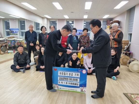 [충청뉴스큐] 대전 서구 도마1동 행정복지센터는 도화풍물단으로부터 이웃사랑 후원금 300,000원을 기탁받았다고 18일 밝혔다.