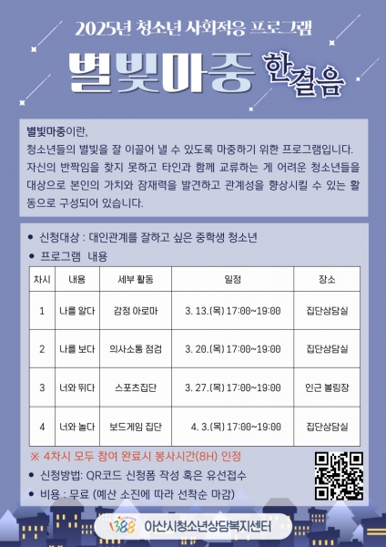 [충청뉴스큐] 아산시의 청소년상담전문기관인 아산시청소년상담복지센터는 3월 매주 목요일마다“별빛마중” 프로그램을 운영할 예정이다.