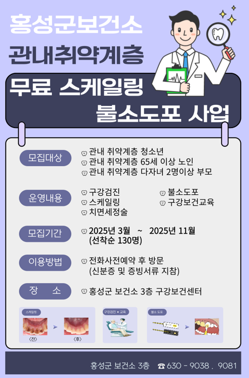 [충청뉴스큐] 홍성군보건소는 군민의 치과의료비 부담 경감 및 구강건강 향상을 위해 취약계층과 노인을 대상으로 무료 스케일링·불소도포 사업을 실시한다고 밝혔다.