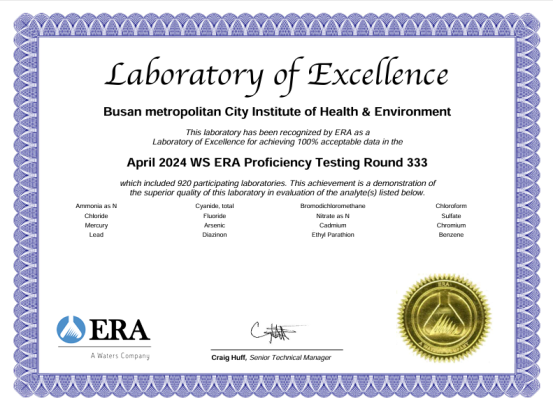 2024년 80여 개국이 참여한 국제숙련도 평가 중 △먹는 물 분야 17개 항목 △수질 분야 21개 항목 △토양 분야 12개 항목 △환경 유해인자 분야 3개 항목 등 평가받은 전 항목에서 최고 등급인 ‘만족’을 받았다.