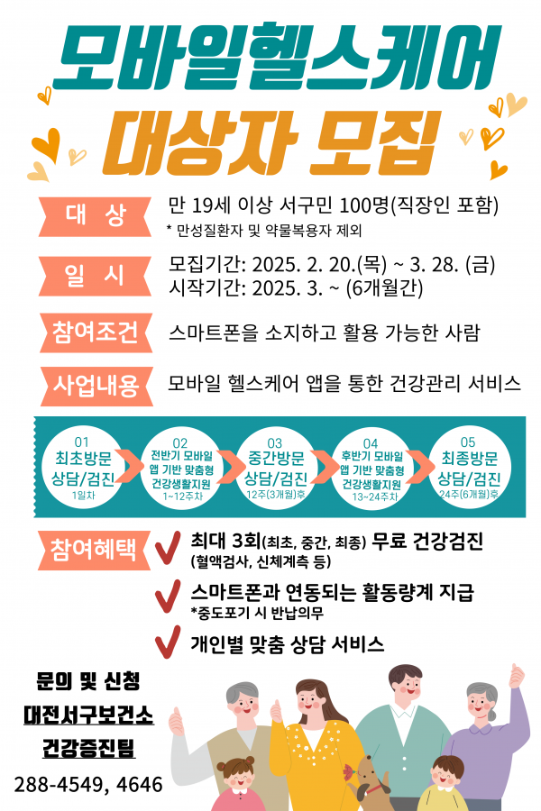 [충청뉴스큐] 대전 서구는 2월 20일부터 3월 28일까지 19세 이상 성인 100명을 대상으로 보건소 모바일헬스케어 앱을 통한 건강관리 서비스사업 신청을 받는다고 전했다.