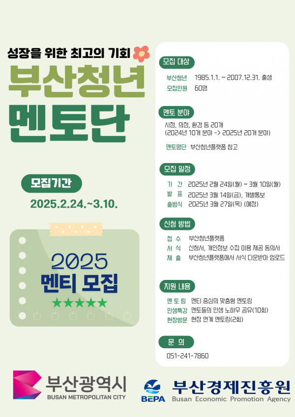 [충청뉴스큐] 부산시는 오늘부터 청년들의 진로 설계와 역량 강화를 위해 '2025년 부산청년멘토단' 사업에 참여할 청년 60명을 모집한다고 밝혔다.