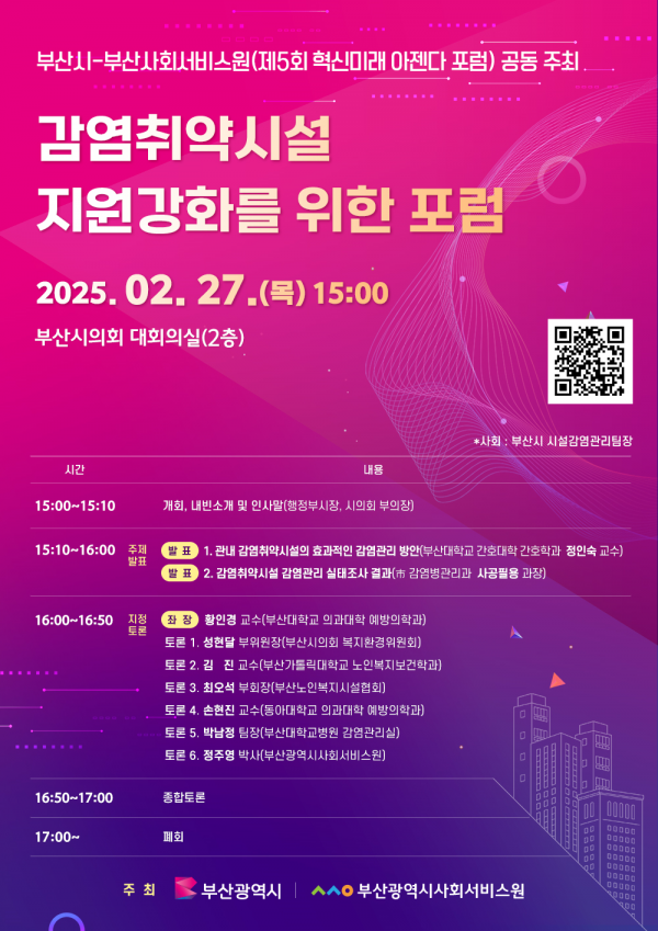 [충청뉴스큐] 부산시는 내일 오후 3시 시의회 대회의실에서 감염취약시설 지원 강화 방안을 논의하는 포럼을 개최한다고 밝혔다.