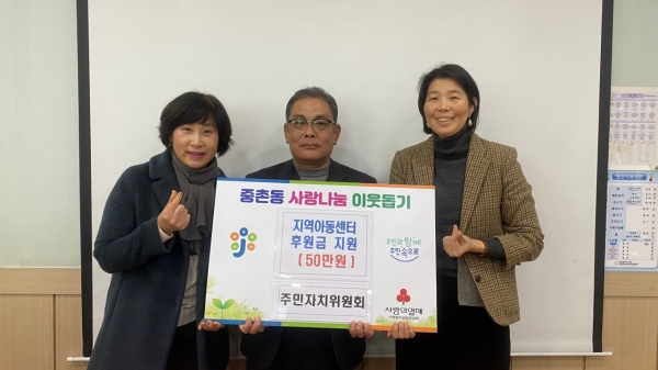 [충청뉴스큐] 대전 중구 중촌동은 지난 26일 주민자치위원회에서 중촌동 지역아동센터 '꿈꾸는 아이들'에 후원금 50만원을 전달했다고 밝혔다.
