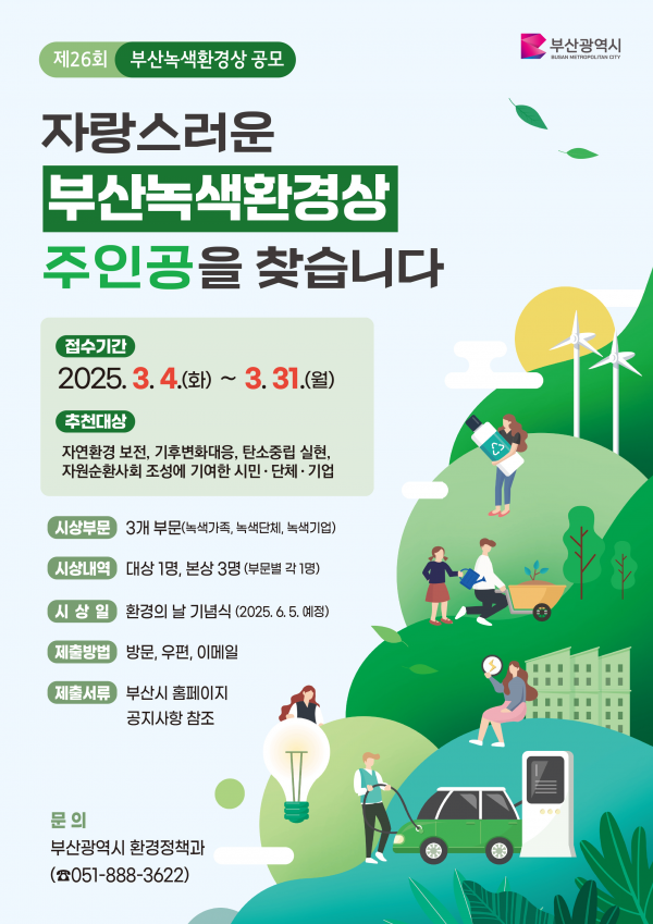 [충청뉴스큐] 부산시는 저탄소 그린도시 조성에 솔선수범하고 지역 환경보전과 환경분야 발전에 이바지한 '부산녹색환경상' 후보자를 오늘부터 3월 31일까지 추천받는다고 밝혔다.