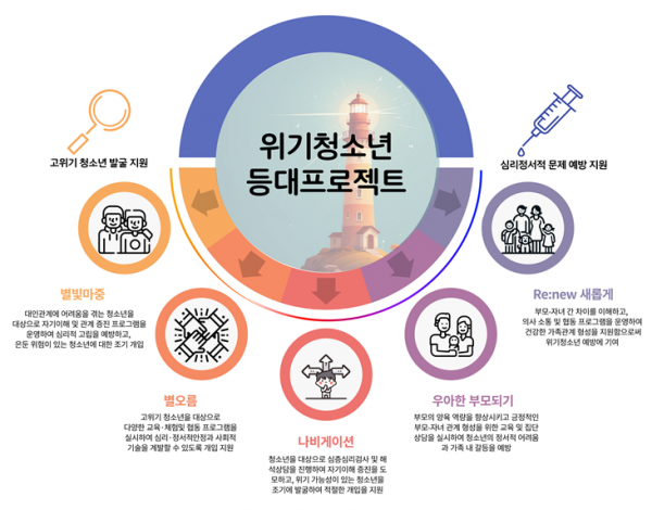 ‘위기청소년 등대프로젝트’는 캄캄한 밤바다를 비추는 등대처럼, 어려움을 겪는 청소년들을 조기에 발견하고 예방적 지원을 통해 건강한 성장을 돕는 통합 프로젝트이다.