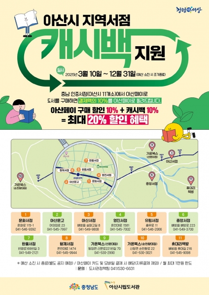 [충청뉴스큐] 아산시가 지역서점 활성화와 독서문화 확대를 위해 10일부터 ‘2025년 지역서점 캐시백 지원사업’을 시행한다.