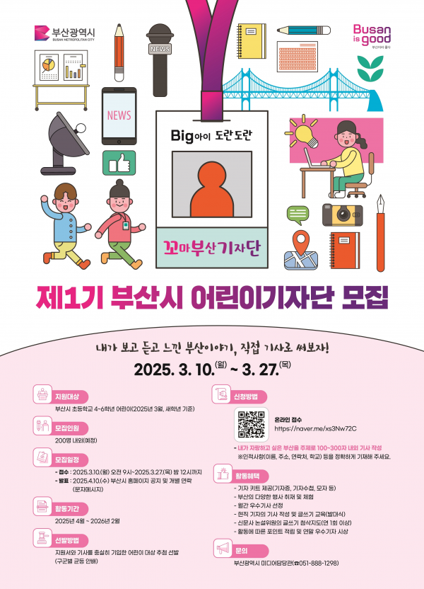 [충청뉴스큐] 부산시는 오는 6월 부산 어린이신문 ‘Big아이 도란도란’ 창간을 앞두고 어린이들이 직접 취재하고 기사를 작성하는 '제1기 부산시 어린이기자단'을 모집한다고 밝혔다.