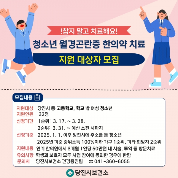 신청 자격은 2025년 1월 1일 기준 당진시에 주소를 둔 청소년이며 선정 기준은 1순위로 2025년 기준 중위소득 100% 이하 가구, 2순위로 월경통 치료를 희망하는 여성 청소년이다.