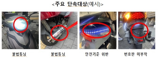 주요 단속 대상으로는 △전조등 및 소음기 등의 불법 튜닝, △안전기준 위반, △미사용 신고 운행, △번호판 미부착·훼손·가림 등 자동차관리 법령 위반 이륜자동차이다.