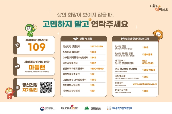 자살 고위험 시기 동안, 대구시는 자살예방 상담전화와 정신건강 상담전화를 다양한 채널로 홍보해 시민들에게 즉각적인 도움을 받을 수 있는 정보를 제공할 계획이다.