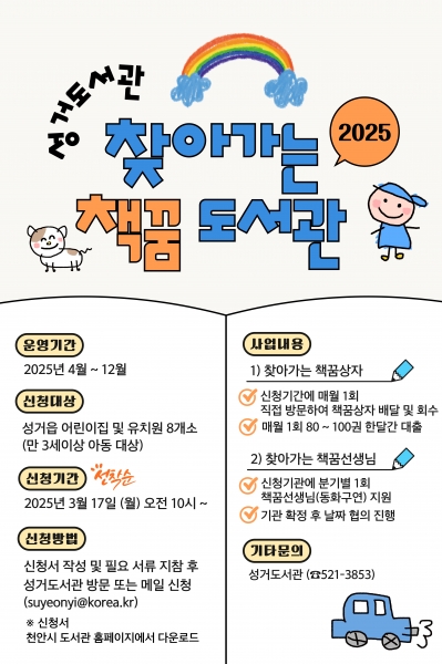 [충청뉴스큐] 천안시 성거도서관은 오는 4월부터 ‘찾아가는 책꿈 도서관’을 운영한다고 11일 밝혔다.