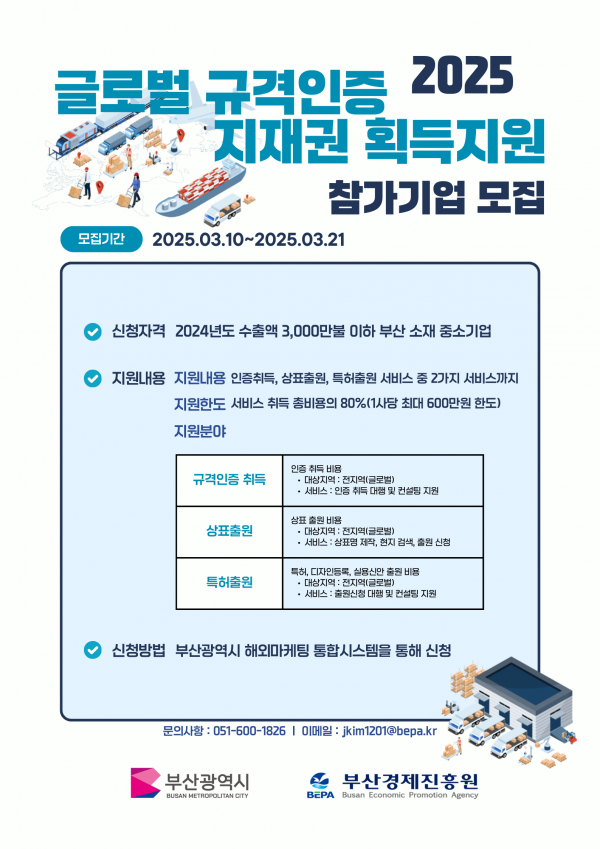 [충청뉴스큐] 부산시와 부산경제진흥원은 지역 중소기업의 수출품에 대한 해외규격인증 취득과 지식재산권 확보를 위한 지원사업을 확대 추진한다고 밝혔다.