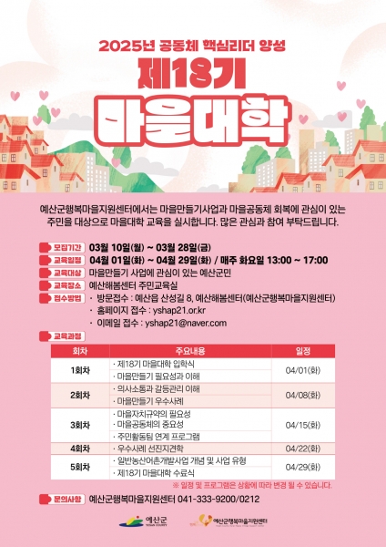 [충청뉴스큐] 예산군은 2025년 예산군행복마을지원센터 주관 제18기 마을대학 수강생을 오는 28일까지 모집한다.