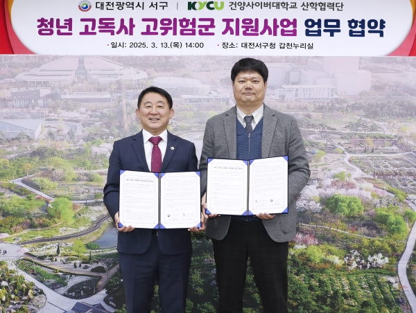 [충청뉴스큐] 대전 서구는 이달 13일 구청 갑천누리실에서 건양사이버대학교 산학협력단과 청년 고독사 고위험군 지원사업 추진을 위한 업무협약을 체결했다.