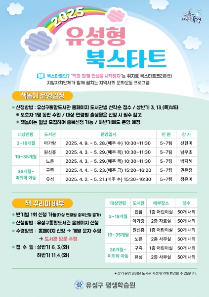 정용래 유성구청장은 “북스타트 사업을 통해 아이들이 자연스럽게 독서 습관을 형성할 수 있는 계기가 되길 기대한다”며 “책과 함께 성장할 수 있는 독서 환경 조성을 위해 노력하겠다”고 말했다.