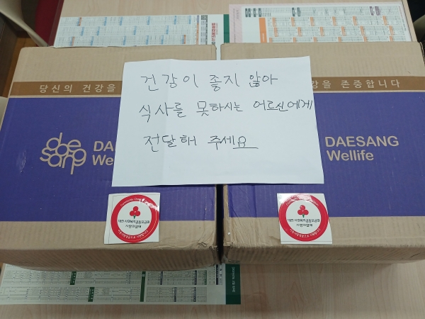 메모에는 ‘건강이 좋지 않아 식사를 못하시는 어르신들에게 전달해 주세요’라고 적혀있었으며 상자 안에는 30만원 상당의 환자용 식음료가 들어 있었다.