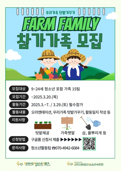 [충청뉴스큐] 천안시청소년재단 천안시태조산청소년수련관이 오는 20일까지 가족텃밭 가꾸기 프로그램 ‘FARM FAMILY’ 참가 가족을 모집한다.