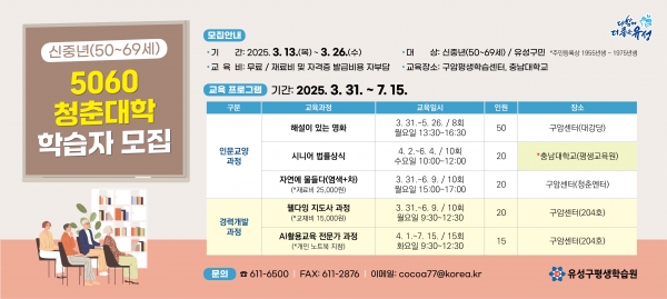 [충청뉴스큐] 대전 유성구는 50~60세대 신중년을 대상으로 ‘5060 청춘대학’을 운영한다고 14일 밝혔다.