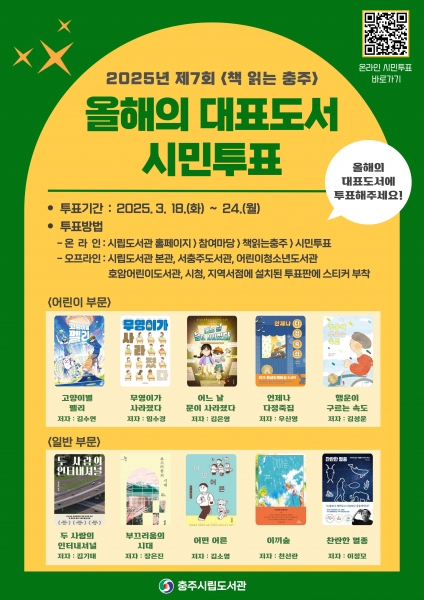 [충청뉴스큐] 충주시립도서관은 2025년 제7회 ‘책 읽는 충주’ 독서운동과 함께 할 올해의 대표 도서 선정을 위해 오는 24일까지 시민 투표를 시행한다.