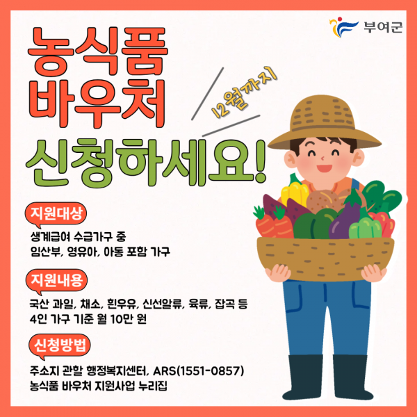 신청 대상은 부여군에 거주하는 생계급여 수급가구중 임산부, 18세 이하 아동이 포함된 가구이며 1인 가구 월4만원, 최대 10인 이상 가구인 경우 18만 7천 원을 차등 지원한다바우처는 연중 수시 신청할 수 있으나 12월은 카드발급일을 고려해 12월 12일까지 신청해야 한다.