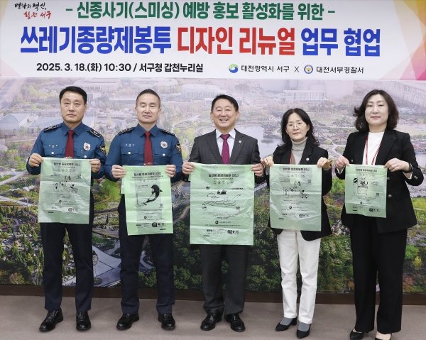 [충청뉴스큐] 대전 서구청과 대전서부경찰서는 지난 18일 구청 갑천누리실에서 쓰레기 불법투기 과태료 관련 스미싱 예방을 위한 ‘쓰레기종량제봉투 디자인 리뉴얼 업무 협업’을 체결했다고 밝혔다.